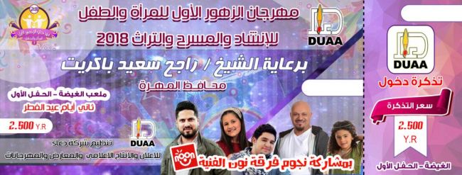 برعاية المحافظ: انطلاق مهرجان الزهور الأول في المهرة بمشاركة نجوم قناة نون ثاني و ثالث أيام عيد الفطر . برعاية كريمة من الشيخ راجح سعيد باكريت محافظ المهرة رئيس المجلس المحلي و تنظيم شركة دعاء للإعل...