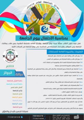 جامعة حضرموت تعلن عن بدء التقدم لجوائز الجامعة للإبداع الطلابي في مختلف المجالات ضمن الاحتفال بذكرى تأسيسها في أبريل القادم أشرف باجبير : ضمن تحضيرات جامعة حضرموت لفعاليات الاحتفال بيوم الجامعة لعام 2018م في إبريل القادم أعل...