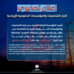 مؤسسة كهرباء عدن تمهل كبار الشخصيات والمؤسسات الإيرادية 10 أيام لتسديد فواتير الاستهلاك دعت المؤسسة العامة لكهرباء عدن كبار الشخصيات والمؤسسات الحكومية الإيرادية بالعاصمة عدن بتسديد فوا...