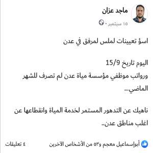 بسبب طريف.. مدير مؤسسة المياه بعدن يوقف راتب موظف اوقف المهندس محمد باخبيرة مدير مؤسسة المياه بعدن راتب موظف. وقال الموظف بالمياه ماجد عزان ف...