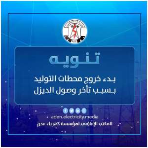 عاجل : بدء الخروج التدريجي لعدد من محطات التوليد في عدن تنوه المؤسسة العامة لكهرباء عدن عن بدء الخروج التدريجي لعدد من محطات التوليد بسبب نفاد وقود الديزل و...