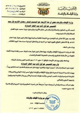 الخميس أول أيام عيد الفطر المبارك ..(وثيقة) اعلنت وزارة الأوقاف والإرشاد اليوم ان يوم الاربعاء هو اليوم المتمم لشهر رمضان المبارك وأن يوم...