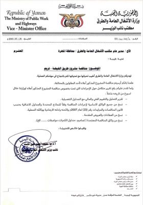 رئيس الوزراء يوجه بإيقاف العمل في مشروع طريق الغيضة - منعر - تريم، والمحافظ باكريت يرفض وجه نائب وزير الأشغال العامة والطرق بإيقاف العمل في مشروع طريق الغيضة - منعر - تريم الاستراتيجي. &n...