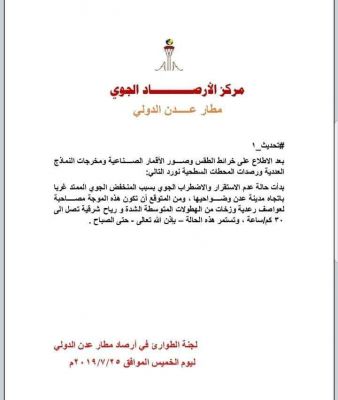 #تحديث_1 : صادر عن الأرصاد الجوية في مطار عدن الدولي بعد الاطلاع على خرائط الطقس وصور الأقمار الصناعية ومخرجات النماذج العددية ورصدات المحطات السطحية: &...