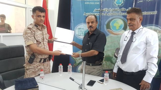 الحيد يكرم قائد كتيبة حزم عدن (١) تقديرا لجهوده في حماية أراضي المنطقة الحرة عدن قام الأخ حسن احمد الحيد رئيس المنطقة الحرة عدن بمكتبه صباح يوم الأربعاء الموافق 2019/7/18م بمن...
