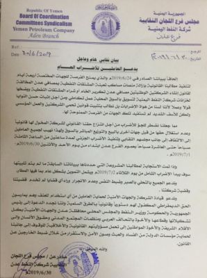 *مجلس فرع اللجان النقابية بشركة النفط يدعو العاملين بالشركة للبدء بتنفيذ الاضراب الجزئي اعتبارا من يوم غدا الاحد ( بيان )* دعا مجلس فرع اللجان النقابية لعمال وموظفي فرع شركة النفط اليمنية في العاصمة عدن جميع العاملين الى ال...