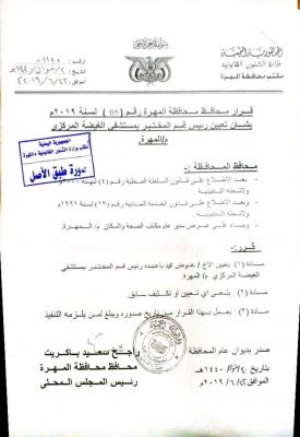 صدور قرار جديد يتعلق بالمهرة أصدر محافظ محافظة المهرة الشيخ راجح سعيد باكريت، اليوم، قراراً إدارياً رقم ( 118 ) للعام 2019م، والذ...