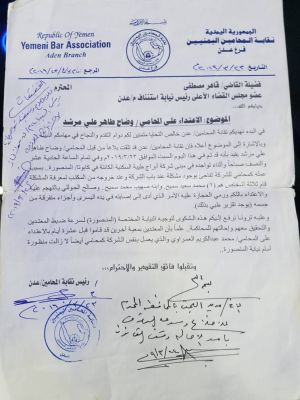 نقابة المحاميين اليمنيين تطالب بضبط المعتديين على المحامي وضاح طاهر علي مرشد بعدن طالبت نقابة المحاميين اليمنيين فرع عدن بضبط المعتديين على المحامي وضاح طاهر علي مرشد والذي تعرض للضر...
