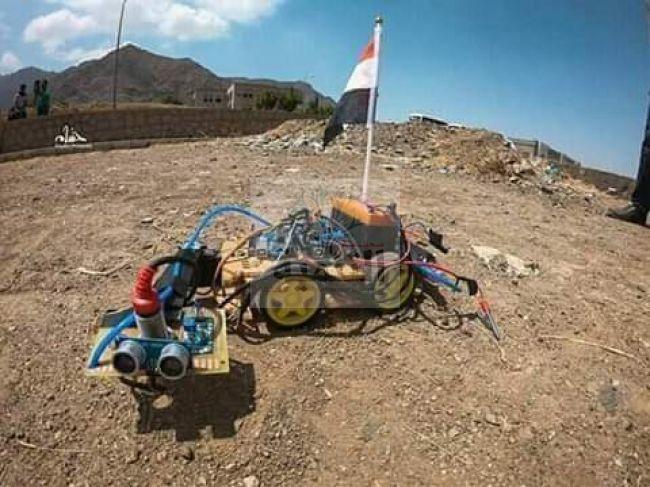 شاهد صورة : يحدث لأول مرة في اليمن ..طالب يبتكر هذا الجهاز أبتكر طالب يدرس في قسم الميكاترونكس كلية الهندسة بجامعة تعز روبوت كاشف للألغام والى جواره اثني...