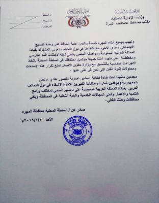 بيان استنكار لمغالطات التقرير الذي أصدره مدير مكتب حقوق الانسان بالمهرة نص البيان : وقفت السلطة المحلية بمحافظة المهرة، اليوم الأحد ، أمام ما أورده التقرير الصادر عن...