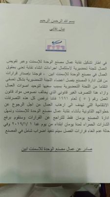 عاجل: اسمنت الوحدة يتخذ قرارات مفاجئة..والتنمية برس ينشرها صدر اليوم عن اداره مصنع الوحده للأسمنت بمحافظه ابين قرارات فصل تعسفيه مخالفه للقانون ضد اللجنه التحض...
