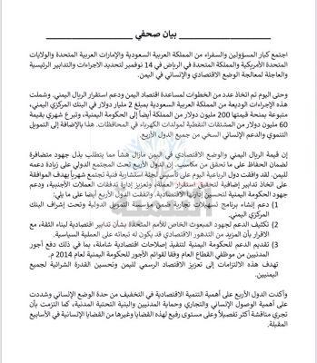 عاجل :مجموعة الدول الاربع تصدر هذا البيان..يتعلق بإجراءات جديدة عن اليمن حصل موقع التنمية برس على بيان صحفي صادر عن مجموعة الأربعة تقر دعم الحكومة لصرف رواتب الموظفين ا...