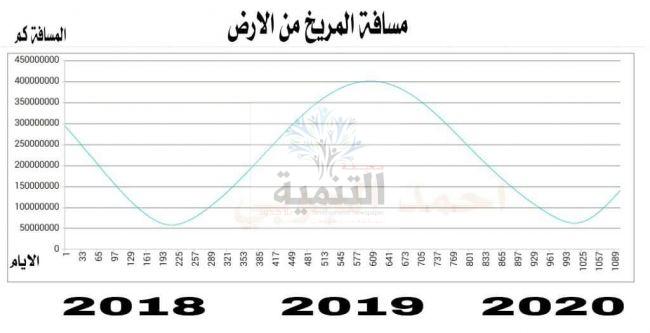 وأختتم منشوره بالقول وهذا رسم بياني دقيق لمسافة المريخ من الارض خلال 2018 و 2019 و 2020 م.