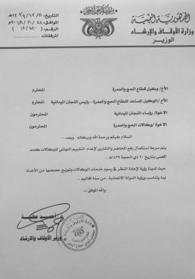 وجه وزير الأوقاف والإرشاد رئيس مكتب شؤون حجاج اليمن الدكتور أحمد عطية اليوم جميع العاملين في المكتب بسرعة رفع المحاضر والتقارير المتعلقة بأداء الوكالات خلال موسم حج هذا العام ١٤٣٩هجرية.