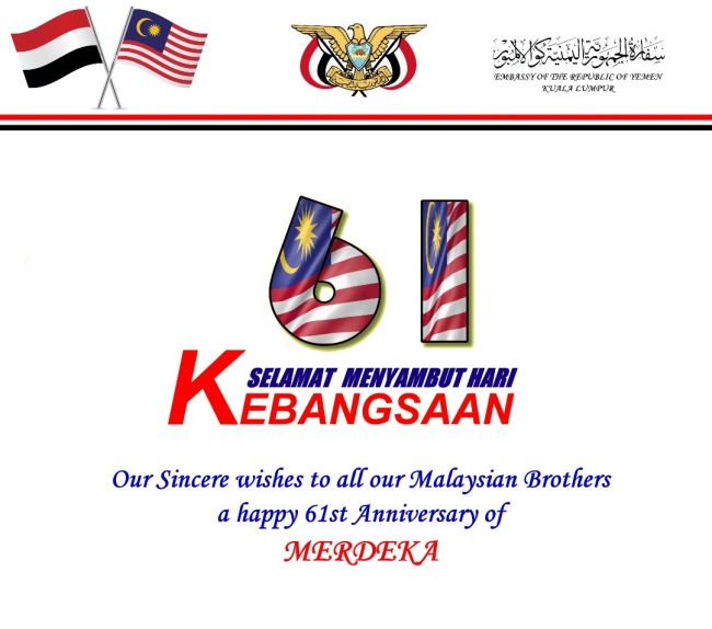 رفعت السفارة اليمنية في ماليزيا وملحقياتها الفنية تهانيها للمملكة ماليزيا، ملكاً وحكومةً وشعباً بمناسبة عيد الاستقلال الوطني الـــ61 للشعب الماليزي.