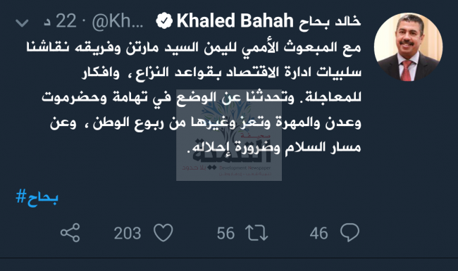 علق الدكتور خالد بحاح رئيس الوزراء الأسبق في منشور على حائطه بتويتر تابعها محرر التنمية برس قائلا مع المبعوث الأممي لليمن السيد مارتن وفريقه نقاشنا سلبيات ادارة الاقتصاد بقواعد النزاع، وافكار للمعاجلة.