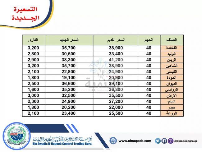 "تعلن مؤسسة بن عوض النقيب للتجارة العامة عن تخفيض  تسعيرة جميع منتجات الأرز بجميع أحجامها وإذ ترجو من الجميع الالتزام بالتسعيرة الجديدة ولهذا ننشر للعلن تسعيرتنا حسب الجدول أدناه."