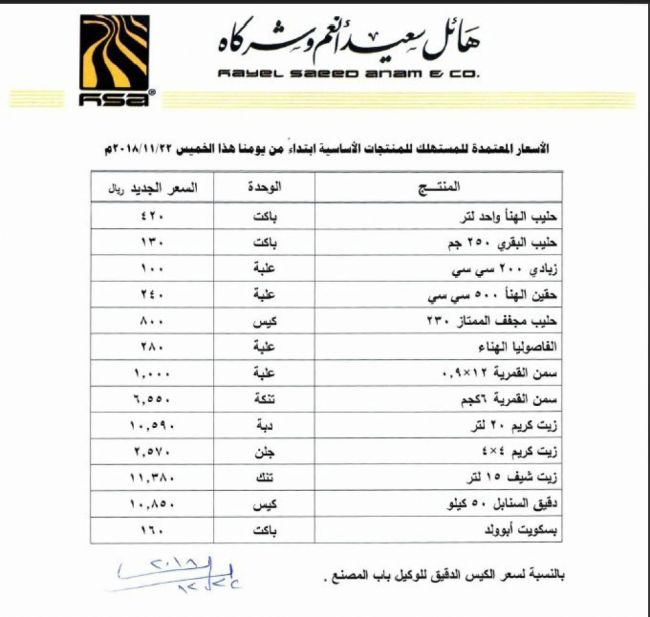 حصل موقع التنمية برس على قائمة باسعار المواد الغذائية التي تم تخفيضها اصدرتها شركة هائل سعيد انعم .