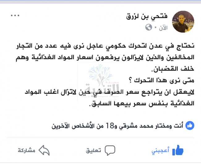نحتاج في عدن لتحرك حكومي عاجل نرى فيه عدد من التجار المخالفين والذين لايزالون يرفعون اسعار المواد الغذائية وهم خلف القضبان.