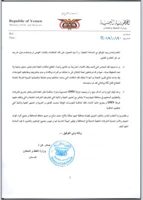 واضافت : " كما تؤكد وزارة النفط والمعادن أن آلیة عملھا تقتضي حمایة الشركات النفطیة العاملة في بلادنا من أي ابتزاز وتقدیم كل الدعم وفقاً للنظام والقانون ولتوجھات الحكومة الھادفة إلى تشجیع الشركات للإستثمار و بما یسھم في تعافي الإقتصاد الوطني .. ولذلك فان وزارة النفط والمعادن تؤكد على استعدادها لتقدیم كافة التسھیلات للشركات والمقاولین المحلیین فیما یتعلق بتعاقدات الخدمات النفطیة والتي تندرج ضمن إطار عملیة التأھیل والالتزام بالمعاییر الفنیة و المالیة المحددة من قبل الشركات النفطیة والمعتمدة من قبل وزارة النفط والمعادن وبما تتوافق مع الصناعة النفطیة، وليس الحصول على تلك التعاقدات بافتعال الفوضى أوبإستخدام طرق خارجه عن اطر النظام والقانون " .