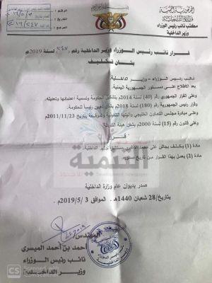 وقضى القرار بتكليف المناضل بجاش الأغبري مستشارا لوزير الداخلية.