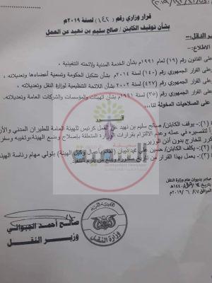 حفظ الصورة عاجل: صدور قرار يتعلق بهذا الامر الإثنين ١٧ يونيو ٢٠١٩ الساعة ٠٧:٥٢ مساءً التنمية برس : خاص أصدر معالي وزير النقل صالح الجبواني قرار يتعلق بإيقاف الكابتن صالح سليم بن نهيد رئيس الهيئة العامة للطيران عن العمل بسبب مخالفات ارتكبها حد قول الوزير الجبواني.