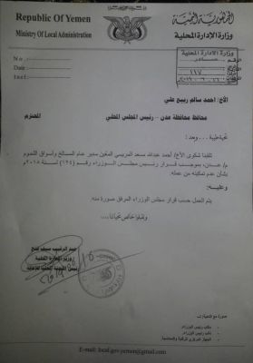 يذكر ان هناك توجيهات صريحة وواضحة صادرة عن وزير الادارة المحلية ورئيس الهيئة الوطنية العليا لمكافحة الفساد والتي وجهت للمحافظ وتطالبه بتنفيذ القرار المتعلق بتعيين الشيخ المريسي مديرا عاما للمؤسسة العامة للمسالخ واسواق اللحوم عدن.