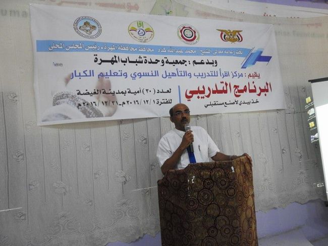 جاء ذلك في حفل تدشين البرنامج التدريبي " خذ بيدي لأصنع مستقبلي " الذي يرعاه الشيخ محمد عبدالله كدة محافظ محافظة المهرة ويقيمه مركز إقرأ للتدريب والتأهيل النسوي وتعليم الكبار لتأهيل عدد (30) أمية بمدينة الغيضة لمدة شهر كامل بدعم جمعية وحدة شباب المهرة ، اليوم الاثنين الموافق 5 / 12 / 2016 ، بحضور الأستاذ محمد صداعي علي وكيل محافظة المهرة لشؤون مديريات الساحل والأستاذ سمير مبخوت هراش مدير عام مكتب التربية والتعليم بالمحافظة والأستاذ أحمد سعيد جمعان بلحاف المدير التنفيذي لصندوق التنمية البشرية بالمحافظة .