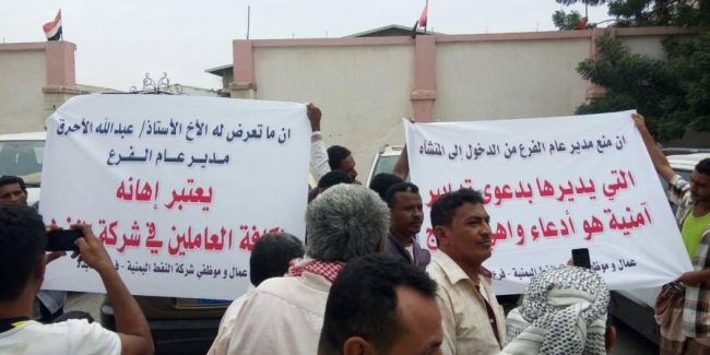 ورفع المشاركون في الوقفة الاحتجاجية لافتات كتب فيها "ان ما تعرض له المدير العام يعتبر اهانة لكافة عمال وموظفي شركة النفط اليمنية" معبريين عن غضبهم واستيائهم من تلك الأعمال غير المسؤولة التي تهدف الى عرقلة سير العمل ومنع الشركة النفط من مزاولة نشاطها في توفير المشتقات النفطية والتخفيف من معاناة المواطنين .