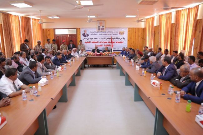 ترأس رئيس مجلس الوزراء الدكتور أحمد عبيد بن دغر، اليوم، اجتماعاً موسعاً بقيادات السلطة المحلية بمحافظة المهرة، بحضور محافظ محافظة المهرة الشيخ محمد عبدالله كده وعدد من الوزراء ونواب الوزراء والقيادات العسكرية والأمنية.