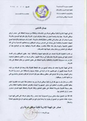 أصدرت نقابة موظفي شركة واي للإتصالات بياناً نقابي أعلنت فيه بدأ الموظفين بالإضراب الجزئي عن العمل والذي سيصل للإضراب الكامل عن العمل وفقاً لمراحل الإضراب الذي أقرته نقابة موظفي شركة واي للإتصال وذلك بعد وصول الشركة للإستنزاف المتعمد لمواردها المالية و لأغراض مشبوهة قد تهدف لوصول الشركة لإعلان الإفلاس والذي بدأ بالمساس برواتب الموظفين وانقطاعها لعدة أشهر والتي قد تمس أيضاً الحقوق التأمينية لموظفي الشركة والذين أكدوا خلال تحملهم للأوضاع الصعبة في ظل إنقطاع الرواتب لشهور حرصاً منهم على استمرار مصدر رزقهم وقوت أسرهم وأولادهم . وأكد البيان أن إقرار هذه الإجراءات التصعيدية والبدأ بها يأتي وفقاً لقانون العمل والدستور اليمني . كما أكد البيان دعوة الجهات الحكومية وقطاع الإتصالات الوقوف معهم في هذه المرحلة التي يمر بها زملائهم في شركة واي من أجل الحصول على حقوقهم والحفاظ على الحقوق المكتسبة . هذا وقد أصدرت نقابات شركات إتصالات أخرى بيانات تضامن مع موظفي شركة واي مهددة بالتوقف عن العمل تضامناً مع زملائهم .