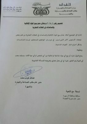 أصدر مكتب الصناعة والتجارة بمحافظة المهرة تعميم تعميم م بشأن منع بيع المساعدات والمواد الإغاثية في المحلات التجارية.
