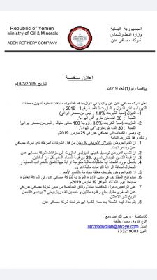 أعلنت شركة مصافي عدن، مساء اليوم، عن إنزال المناقصة رقم ( 1 ) لعام 2019 لشراء وقود لمحطات توليد الطاقة الكهربائية ..