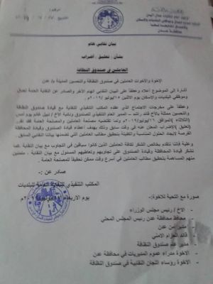 وفي ختام البيان النقابي الهام الصادر عن المكتب التنفيذي للنقابة العامة لعمال البلديات والاسكان والذي تم توجيهه للعاملين بصندوق النظافة والتحسين ونسخ منه لكل من رئيس مجلس الوزراء وقيادة المحافظة والصندوق ومدراء الامن والمديريات والحزام الامني وعدد من الجهات الاخرى ، تقدم المكتب التنفيذي للنقابة بخالص شكره وتقديره للعاملين على تجاوبهم مع البيان السابق للنقابة بشأن اعلان الاضراب ، مع تقديم الشكر ايضا لكل من قيادة محافظة عدن وقيادة الصندوق لتجاوبهم وتعاطيهم البناء والمسئول مع البيان النقابي وماتضمنه من مطالب ولما فيه مصلحة العاملين والمصلحة العامة.