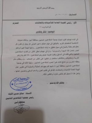 وجه رئيس جمعية المتقاعدين المدنيين بمحافظة أبين صالح حسين الكيله شكر وتقدير ل علي ناصر الهدار رئيس الهيئة العامة للتأمينات والمعاشات وذالك بإدارتهم الحكيمة ل الهيئة والتي ذللت كثير من الصعوبات.