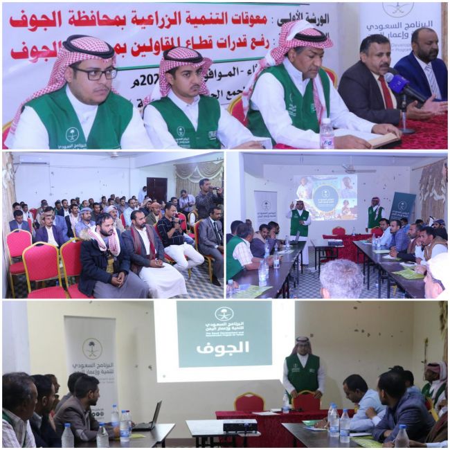 نظم البرنامج السعودي لتنمية وإعمار اليمن ورشتي عمل في محافظة الجوف اليمنية، برعاية محافظ محافظة الجوف رئيس المجلس المحلي اللواء أمين بن علي العكيمي، وبحضور مدير مكتب البرنامج في محافظة الجوف الأستاذ علي الدوسري.