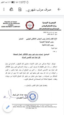 حفظ الصورة مدير مصافي عدن يحدد موعد صرف راتب يونيو ويطالب بإلغاء الاضراب(وثيقة) الخميس ١٦ يوليو ٢٠٢٠ الساعة ١١:٤٣ صباحاً التنمية برس:خاص حصل التنمية برس على وثيقة يظهر فيها رسالة موجه من المدير التنفيذي لمصافي عدن الى قيادة المجلس الانتقالي الجنوبي. وجاء في الوثيقة ان راتب شهر يونيو سوف يصرف قبل عيد الأضحى المبارك. وقال محمد عبدالله ابوبكر مدير مصافي ان على قيادة الانتقالي ان تحل مشاكل الاضراب حتى يتمكنوا من صرف الراتب. واختتم بالقول سيتم صرف الراتب قبل اجازة عيد الأضحى المبارك.