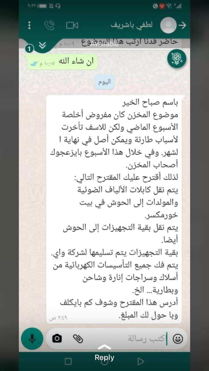 وحث باشريف أيضا نجل شقيقه باسم ب"فك جميع التأسيسات الكهربائية من اسلاك وسراجات وانارة وشاحنات وبطارية وادرس التكلفة وبحولك المبلغ". بينما يرد باسم بالتأكيد أنه يرتب لهذا الموضوع، قبل أن يعود للزعم فيما بعد، ان هناك من اخترق رقم الواتس الخاص به وقام بتسريب بعض رسائله ومنها هذه المرفقة أدناه.