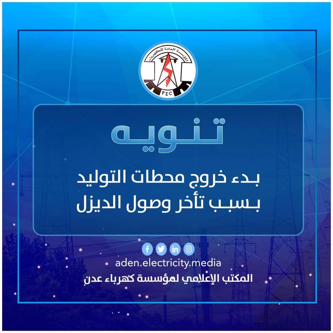 تنوه المؤسسة العامة لكهرباء عدن عن بدء الخروج التدريجي لعدد من محطات التوليد بسبب نفاد وقود الديزل وتأخر وصوله حتى هذه اللحظة للمحطات.