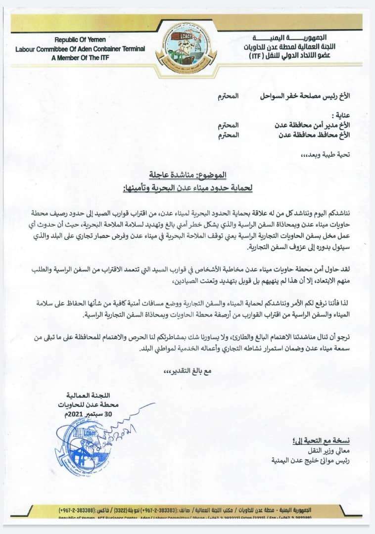 لذا فأننا نرفع لكم الأمر ونناشدكم لحماية الميناء والسفن التجارية ووضع مسافات أمنية كافية من شأنها الحفاظ على سلامة الميناء والسفن الراسية من اقتراب القوارب من أرصفة محطة الحاويات وبمحاذاة السفن التجارية الراسية.
