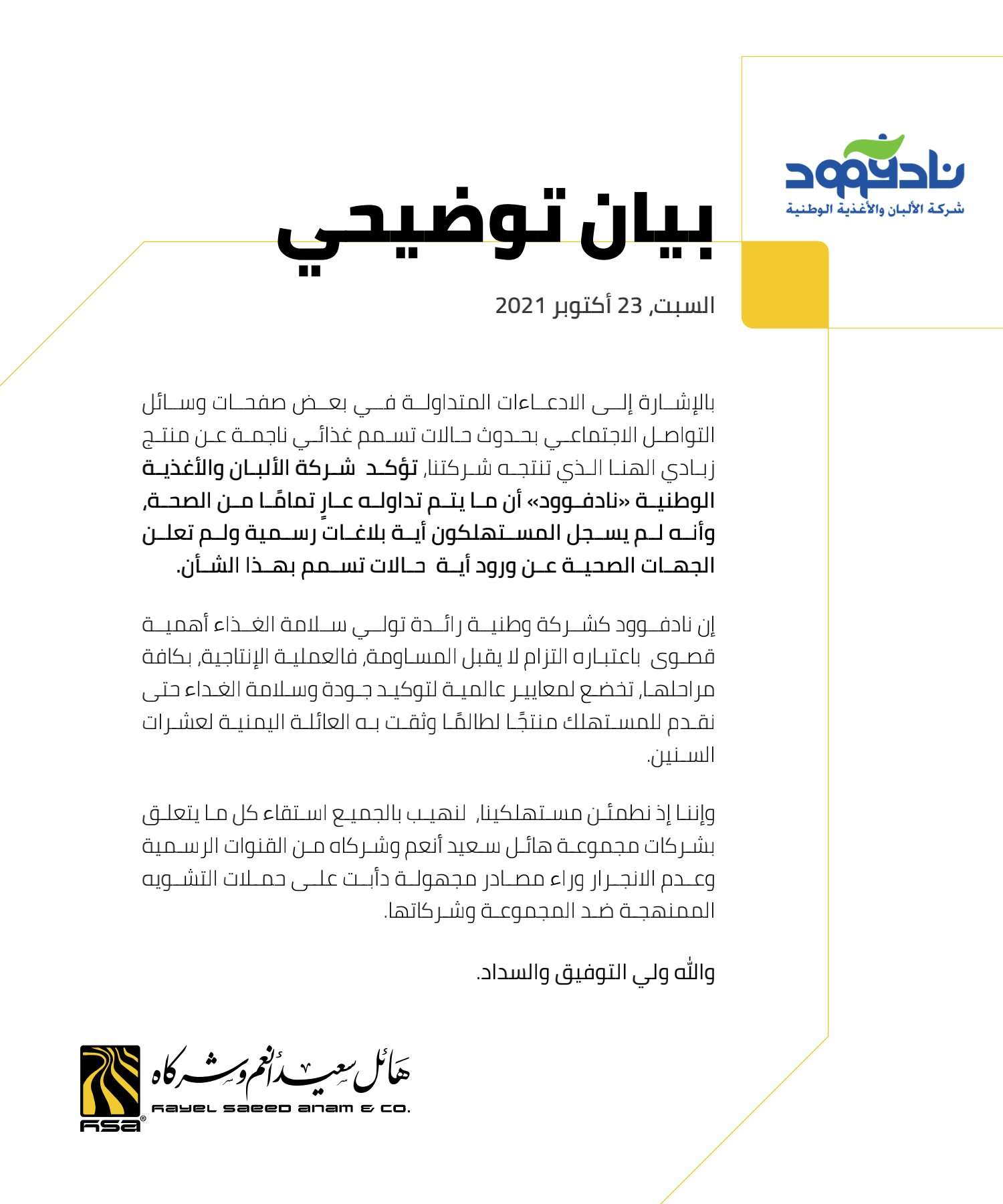 وجاء في بيان الشركة: " وإننا اذا نطمئن مستهلكينا نهيب بتلك المواقع التي روجت لهذه الإشاعة بأن تستقي كل ما يتعلق بشركات " مجموعة هائل سعيد أنعم وشركاه" من القنوات الرسمية وعدم الانجرار وراء مصادر مجهولة دأبت على حملات التشويه الممنهجة ضد المجموعة وشركاتها".