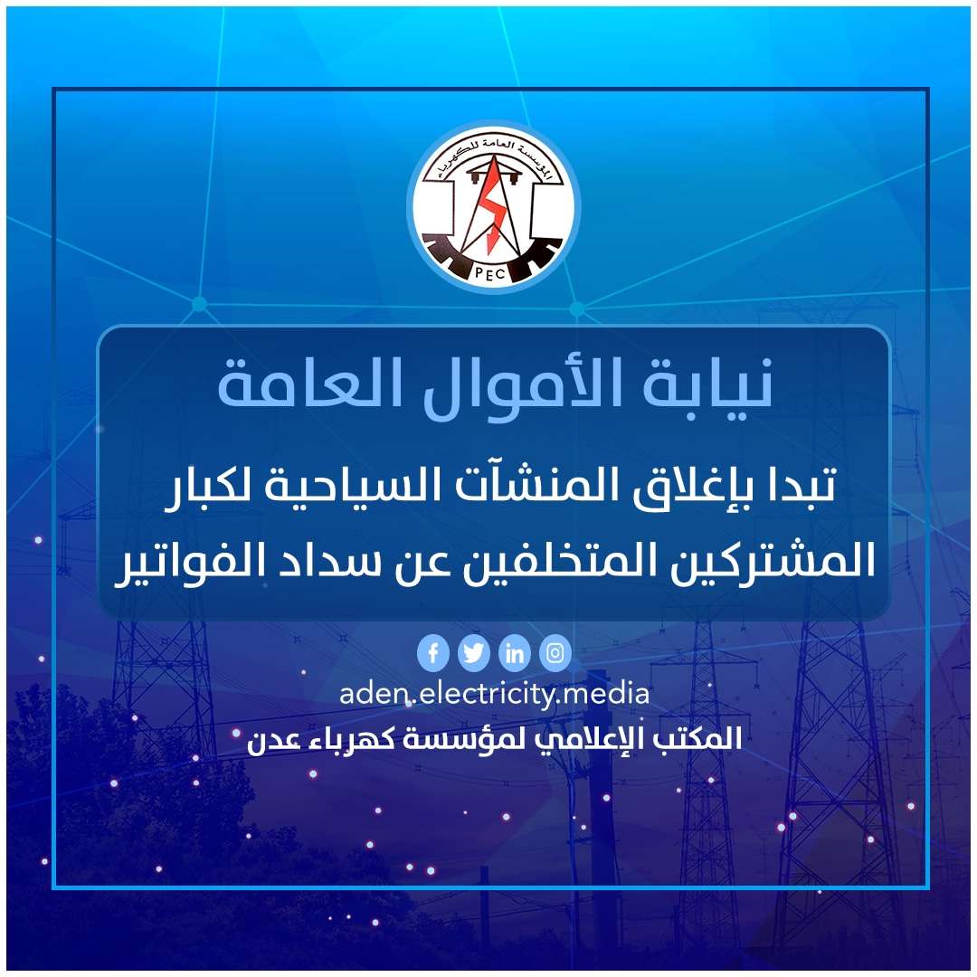 وكانت المؤسسة العامة لكهرباء عدن قد أطلقت منذ شهر اعلان تحذيري لكبار المشتركين المستعصين عن سداد فواتير الاستهلاك بضرورة الاسراع وتسديد ما عليهم من مديونية للمؤسسة قبل أن يتم فصل التيار الكهربائي عن منشآتهم.