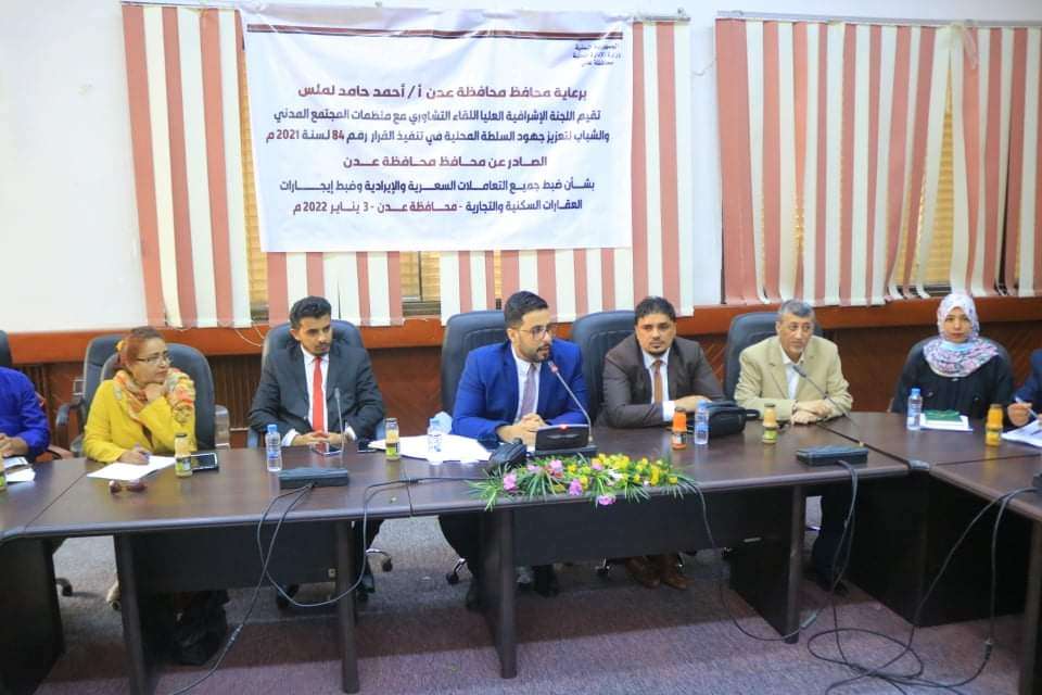 وناقش الاجتماع اليات اشراك منظمات المجتمع المدني والشباب الفعال في عدن لتعزيز جهود السلطة المحلية في في تنفيذ القرار رقم 84 لسنة 2021 لضبط التعاملات السعرية والايرداية وضبط ايجارات العقارات السكنية والتجارية .