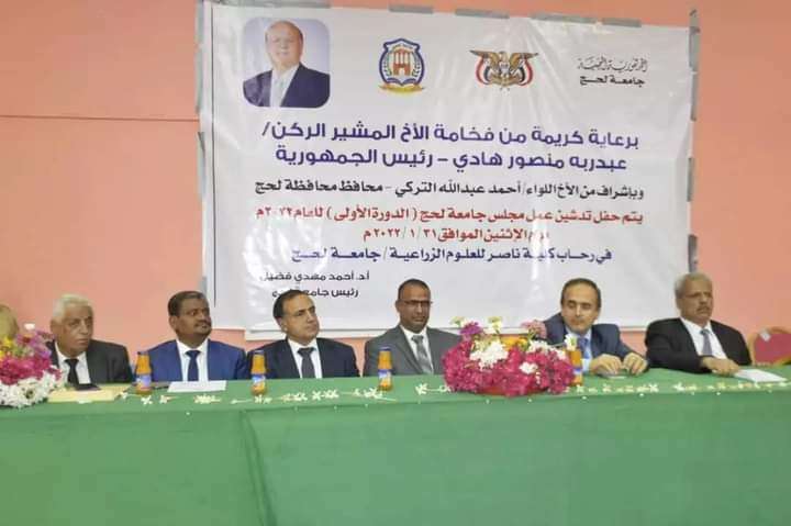 دشن اللواء / أحمد عبد الله تركي محافظ محافظة لحج مع الدكتور/خالد الوصابي وزير التعليم و البحث العلمي و التدريب الفني و المهني و الدكتور/أحمد مهدي فضيل رئيس جامعة لحج الإحتفال الخاص بتدشين عمل مجلس جامعة لحج في دورته الأولى للعام (2022م) اليوم بكلية ناصر للعلوم الزراعية .
