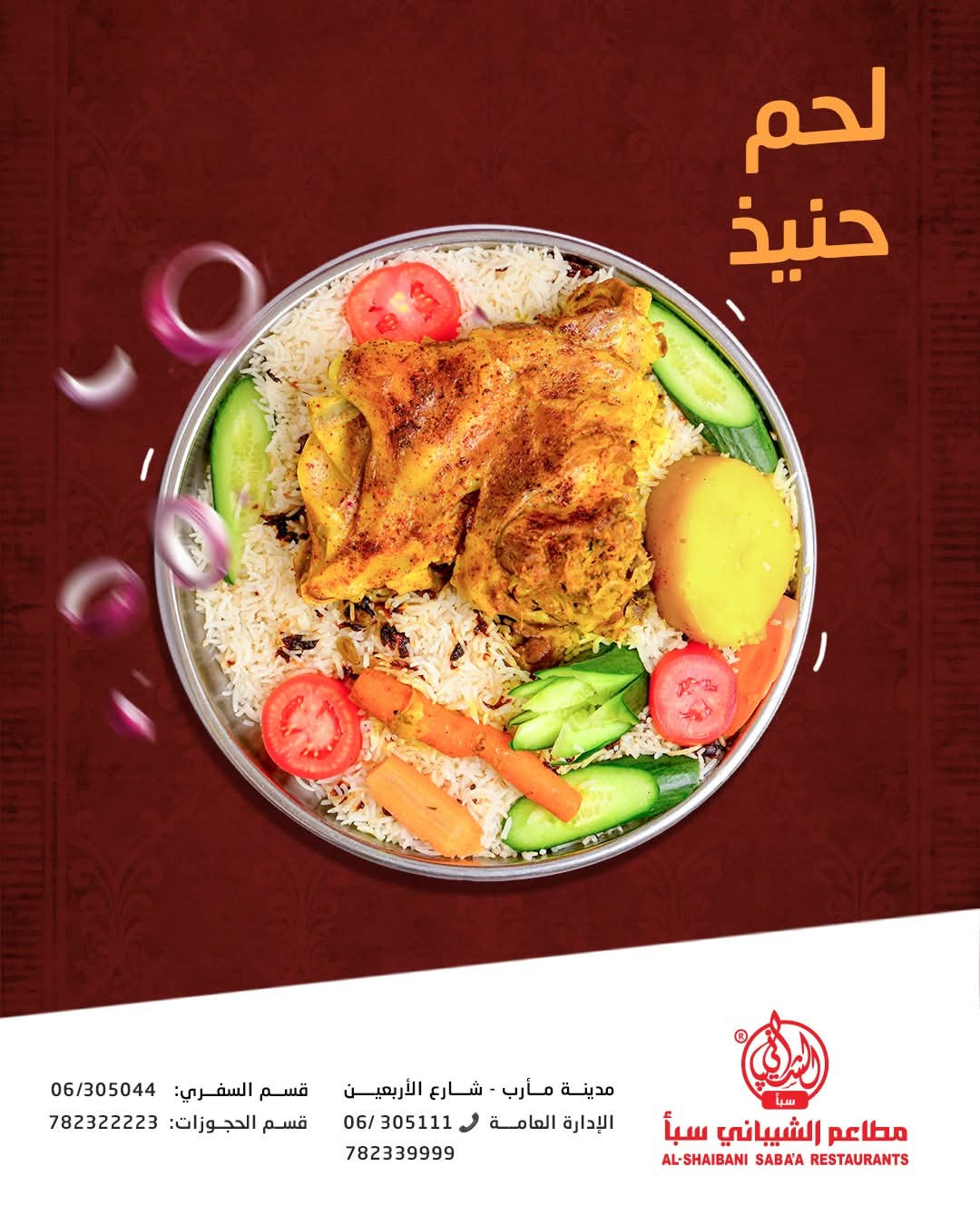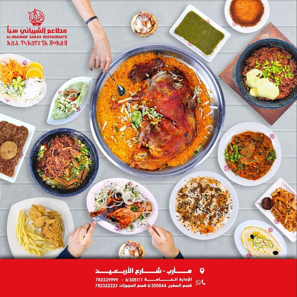 منها المندي اليمني الأصيل والذي يعتبر (نجم قائمة الطعام في الشيباني سبأ )و كون مندي اللحم: يُحضر بأجود قطع اللحم (الغنم ) ويُطهى في "الحفرية" التقليدية، مما يمنحه طراوة لا تصدق وطعماً مدخناً خفيفاً يتشرب به الأرز البسمتي المعتق.