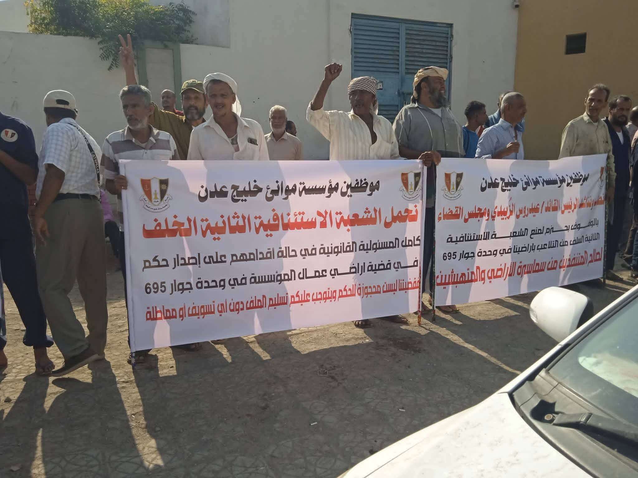 من جانبه، قال جمال علي صالح محمد، أحد موظفي المؤسسة، إن هذه الوقفة هي الرابعة أمام المحكمة، موضحاً أن موظفي مؤسسة موانئ خليج عدن يمتلكون عقوداً رسمية صادرة من هيئة الإسكان والأراضي، إلا أن تلك الأراضي تعرضت للتلاعب ونُقلت إلى تجار، مناشداً مجلس القيادة الرئاسي ونائب رئيس المجلس اللواء عيدروس الزُبيدي الوقوف إلى جانب العمال والموظفين وإنصافهم.