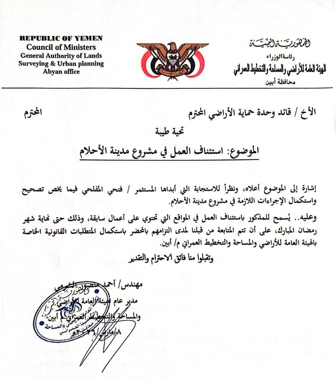 أصدرت الهيئة العامة للأراضي والمساحة والتخطيط العمراني بمحافظة أبين توجيهاً رسمياً يقضي بالسماح باستئناف العمل في مشروع مدينة الأحلام، وذلك بعد استجابة المستثمر واستكمال الإجراءات والمتطلبات القانونية الخاصة بالمشروع.